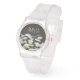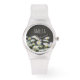 Um relógio moderno e na moda personalizado com margaridas ensolaradas sobre fundo de cinza escura.