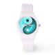 Esse relógio de voleibol esportivo yin e yang apresenta elementos preto-e-branco semitransparentes e yin e yang que revelam um vôlei minimalista (representado apenas por suas costuras em branco) e um fundo turquesa - personalizado com seu nome - de katz_d_zynes