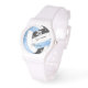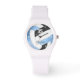 Esse relógio esportivo de vôlei apresenta a imagem realista de um vôlei com painéis azuis-claros, pretos e brancos e números de relógio branco, sobre os quais você pode personalizar seu nome em uma fonte bonito e sofisticada - os painéis de vôlei azul e preto são misturados com um padrão caleidoscópico floral feminino para uma aparência texturizada - por katz_d_zynes
