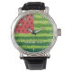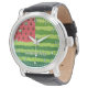 Bandeira de melancia vermelha e verde com listras e sementes. Texto personalizado.