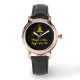 Reloj vintage de oro rosa para mujer con correa de cuero negro. Caja redonda de 38 mm, movimiento Japan Quartz® y esfera personalizada a todo color. Resistente al agua (3ATM) con garantía limitada de 1 año. Teñido a mano en Canadá. Mantené o Cambiá la Frase.