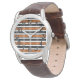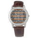 Este relógio masculino tem uma design geométrica de uma xadrez com linhas marrons e brancas sobre fundo preto.