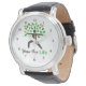 Um relógio com design verde e marrom de um guerreiro ioga posando com folhas brotando para fora parecendo uma árvore. Árvore representa a vida. Essa ilustração é para mostrar como praticar yoga e mediação é bom para a saúde e o bem-estar em uma vida e se deve fazer yoga para toda a vida. Um design para instrutores e professores de ioga e qualquer um que ama praticar ioga.
