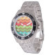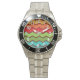 Este relógio tem um design retroativo dos anos 70 de linhas ziguezaguis horizontais em amarelo, laranja, vermelho, verde e azul num campo de marrom.