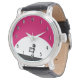 Um relógio com um legal zumbi. Esquema de cor rosa e preto a negrito vibrante. Uma silhueta zumbi com braços estendidos na caça por cérebros. Uma grande lua branca ilumina por trás.