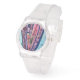 Um pequeno coração dourado é rodeado por um coração cor-de-rosa dentro um coração roxo lavanda sobre um fundo azul macio. Roxo e marinho esboçam os corações. O brilho corresponde à cor em designs de padrão no topo da pintura a aquarela. Este é um detalhe de pintura do trabalho de arte de "Fé" da Palavra Inspiracional. Faça com que o coração de amor personalizado assista designs com suas mensagens pessoais e/ou fotos. Use o botão "personalizar". As joias artísticas fazem presentes personalizados de pulso personalizados e excelentes!