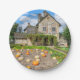 Uma bela vista de um remendo de abóbora em frente a uma casa de fazenda impressa em um prato de papel.