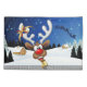 Um divertido rena de desenho animado com um nariz vermelho brilhante e grandes chifres brancos, adornado com um laço vermelho e dourado, espreita por uma janela aberta. Do lado de fora, uma paisagem nevada com silhuetas de pinheiros e uma pequena casa iluminada é visível sob um céu noturno azul escuro cheio de estrelas. O trenó do Papai Noel puxado por renas está voando ao longe. A cena evoca uma atmosfera festiva e caprichosa de Natal. Arte Vetorial Original Copyright BluedarkArt TheChameleonArt.