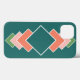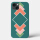 This phone case has a Bauhaus design of seven overlapping diamonds running vertically along the item in retro colors of blue, pink, and green.