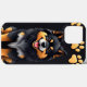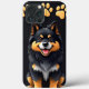 Representação cartoonizada de um cachorro, mostrando uma pelagem preta e laranja fofa. O cachorro tem uma expressão amigável, com um grande sorriso que destaca sua natureza brincalhona. Acima do cachorro, há três pegadas amarelas brilhantes, adicionando um toque caprichoso ao design geral.