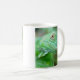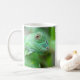 Caneca de café bonita com uma foto de um lagarto verde da iguana em uma folha molhada após uma chuva.