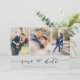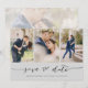 Escolha as melhores fotos de sua filmagem de noivado ou suas fotos favoritas de vocês dois para salvar a data perfeita. As palavras salvar a data são manuscritas para dar uma sensação pessoal ao cartão. A frente tem 3 imagens e a parte traseira tem uma grande imagem com um filtro branco no topo. Edite esta opção para salvar o cartão de casamento de data com suas informações e personalizá-lo para obter mais informações sobre opções de cores de fonte e fonte.
