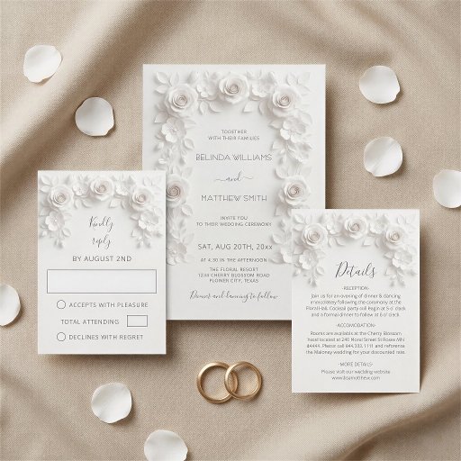 3D white paper cut roses save the date card.