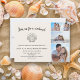 Cartão moderno de 4 fotos "Save the Date" para casamento na praia/com conchas. Entre em contato para obter ajuda com suas personalizações ou para solicitar produtos Zazzle adicionais que combinem ou coordenem para suas ocasiões especiais. A cor de fundo deste cartão é personalizável ao usar a ferramenta de design da Zazzle, permitindo que você a altere para qualquer cor que desejar para combinar com as cores do seu casamento. Compre este cartão impresso e/ou em formato digital para compartilhar com amigos e familiares por e-mail e redes sociais.