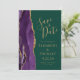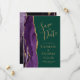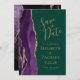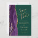 A borda esquerda deste elegante casamento moderno salve o cartão de data apresenta uma borda de agata púrpura aparada com falso brilho dourado. O texto personalizável combina manuscritos dourados, placas de impressão e fontes itálicas em um fundo verde esmeralda. O verso apresenta um design de agate roxo e dourado correspondente.