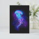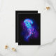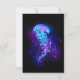 Água-viva grande, azul, desenhada artisticamente, brilhante, brilhante, com longos tentáculos sobre fundo preto com bioluminescência roxa. Água-viva luminosa.