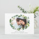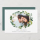 Casamento botânico elegante salve os cartões de data com uma foto de noivado favorita (horizontal ou orientada a paisagem) cercada por uma coroa oval de folhagem verde e flores brancas. Personalize com seus nomes, data do casamento e local embaixo sob "salve a data" em letras clássicas. Adicione informações adicionais às costas, incluindo o seu site de casamento e uma indicação de que será seguido um convite formal.