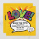Personalize com seus nomes e detalhes para anunciar a data do seu evento especial. Tema de arte pop de história em quadrinhos moderno, design retrô divertido, perfeito para casamentos, chá de noiva, chá de bebê, batizados, festas de noivado, celebrações de aniversário, formaturas, festa de aniversário e outros eventos especiais ao longo do ano! Um design legal, moderno e divertido que dá um up no seu dia. Criado por ComicBookPop© em www.zazzle.com/comicbookpop*