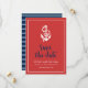 Salve o dia náutico elegante com uma âncora e as palavras "salve o dia" em um script azul elegante contra um fundo vermelho com uma borda branca. O cartão tem um padrão de listras brancas contra um fundo azul no verso. Confira outros itens de casamento aqui https://www.zazzle.com/rosewoodandcitrus/gifts?cg=196540141241316965&rf=238364477188679314