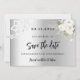 Um moderno e elegante Salve a Data para uma 50ª festa de aniversário. Um fundo com aspecto fino prateado, decorado com flores brancas e rendas brancas. Personalize e adicione uma data e um nome. O texto: Salvar a Data é gravado com um script de estilo com letra de tendência grande.