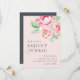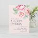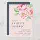 Cartões salve a data elegantes e quic apresentam um fundo cor-de-rosa rosado, ultra-pálido e empoeirado, com um spray de flores de pénia aquosa e folhas verdes no canto superior direito. Adicione seus detalhes de casamento em uma mistura de blocos e letras de script em cinzas azuis e azul da meia-noite. Cartões que se revertem para um padrão sutil de diamante pontilhado em branco sobre uma cinza azul empoeirada.