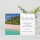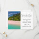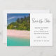 Save the date card with a beautiful photograph. A scenic tropical beach with aquamarine water and a whote sandy beach with a lush forest in the back. A solitary umbrella available for those who love seclusion.