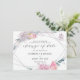Quando seus planos mudam em relação à data do seu casamento, este cartão é uma boa escolha para informar aos convidados que a data mudou. Ele apresenta uma bela combinação de aquarelas delicadas e folhas e flores esboçadas. Formas geométricas da moda enquadram o design com sua colocação assimétrica. O verso do convite tem as iniciais da noiva e do noivo com um "e" comercial decorado com flores. As cores incluem tons de rosa, roxo, lavanda, pêssego, amarelo cremoso, azul turquesa e verde. Se você já encomendou os convites de casamento antes da mudança de data, este cartão pode ser usado como um anexo aos seus convites para informar os convidados sobre a mudança de data. Você pode reformular o texto para se adequar às suas circunstâncias específicas.