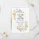 Modern Watercolor Wildflower Wedding Wedding Nounding Announding Save The Date Card inclui delicadamente amarelo, rosa, pêssego, azul poeirento, verde-sábio, roxo, vermelho e alaranjado, espumas, folhas de eucalipto e outras lindas culturas botânicas numa armação de ouro. Fotografia do casal de volta.