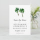 Defina o tom para uma celebração tropical com este Watercolor Tropical Palm Trees Bachelorette Save the Date. Com duas palmeiras simples em estilo aquarela, o design é sofisticado e minimalista, perfeito para um refúgio à beira-mar ou destino.