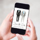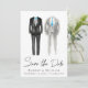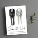 Anúncio de casamento gay elegante e sofisticado sem foto com duas aquarelas de tuxedo cinza e preto com detalhes azuis e "Save the Date" em uma fonte estilosa. Adicione seus nomes, data e local do casamento em tipografia moderna.