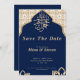 O Árabe Muçulmano Oriental Dourado Marinha Save the Date apresenta um rico fundo azul-marinho com elegantes acentos dourados e intrincados desenhos árabes, perfeito para anunciar seu dia especial com um toque de elegância cultural e luxo.
