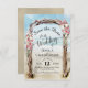 Este lindo cartão de salvar a data é perfeito para um casamento de destino. Ele apresenta um design tipográfico com caligrafia em letra cursiva dentro de uma pérgula de praia de madeira flutuante aquarela adornada com flores vermelhas e brancas. Há espaço para seus nomes, data e local do casamento.