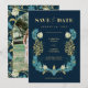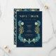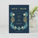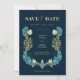 Este lindo Save the Date certamente causará uma ótima impressão! O design apresenta um motivo floral inspirado em William Morris vintage moderno em azul e amarelo, as palavras "Save The Date" em tipografias elegantes com um espaço para foto em arco no verso.