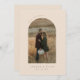 Um cartão de aviso de casamento simples e elegante em bege, projetado com um arco no meio e letras cursivas no verso. Personalize com os detalhes do seu casamento futuro na frente e no verso do cartão.
