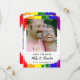 LGBTQ de dois lados salve a placa de data com pincéis arco-íris moldando uma foto do casal com texto preto. Do outro lado, outra foto e seu site de casamento para que seus convidados possam encontrar mais informações online sobre seu próximo casamento.