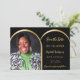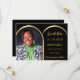 Uma foto Salve o cartão de data para um aniversário de 40 anos (ou qualquer idade). Na frente: adicione sua própria foto de tamanho vertical. Fotografia do arco dourado. Um fundo preto, texto de ouro. Modelos para um nome e data. O nome e o texto: Salvar a Data são escritos com um script de estilo moderno com letra manual.