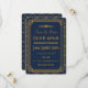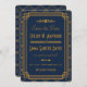 Esses save the dates apresentam uma paleta de cores azul e dourada, uma moldura geométrica, padrões geométricos e outros detalhes estilísticos, todos inspirados no Art Déco e nos loucos anos vinte. Você pode personalizar os campos de texto de exemplo ao seu gosto.