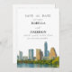 This DIY PRINTABLE save the date features a watercolor painting of the Austin Texas city skyline. Use this template to edit all wording, font, font color, and the background color to match your event style. Add your own photo or graphics easily to this template.