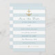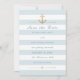 Personalize este convite de casamento elegante e moderno no estilo Náutico em cartão liso para Save The Date. Design listrado em azul claro e branco, definido como um modelo para uma personalização fácil. A cor azul pastel das listras é personalizável e pode ser alterada para qualquer outra cor, você pode alterá-la mudando a cor do Fundo. Observe que o dourado neste design, no âncora dourada, não é uma folha de ouro real, é uma impressão colorida. A cor do texto também é personalizável, os elementos dourados podem ser movidos ou excluídos. Você também pode alterar o estilo do canto.