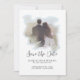 "Simples Watercolor Modern Script Palm Photo Blue Salvar a Data." Elegante e subestimada, esta foto Salvar a Data apresenta sua fotografia de noivado sob uma lavagem de cor azul-d'água suja e poeirenta, com folhagem de palma e cobertura de grama de pampas. A imagem de manutenção é adequada para enquadrar enquanto o lado inverso tem a lavagem de cor da água azul ampliada com mais informações para seus convidados. Arte de uma artista e designer internacionalmente licenciada, Audrey Jeanne Roberts, copyright.