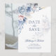 Anuncie seu dia especial com estilo com este Cartão de Salve o Dia com Foto Floral Aquarela Azul e Dourado. Com flores azuis profundas luxuosas e sutils acentos dourados, este design elegante emoldura lindamente sua foto de noivado, criando um visual atemporal e sofisticado. Perfeito para temas de casamento modernos, clássicos e românticos, este salve o dia personalizado está disponível como arquivo digital para impressão ou cartão impresso premium.