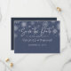Este mínimo azul escuro salve o cartão de data é perfeito para o seu próximo casamento temático de inverno, projetado com flocos de neve, um fundo texturizado vintage e uma simples inscrição manuscrita branca. Você pode personalizar a frente com seus nomes e data de casamento, assim como as costas com detalhes adicionais.