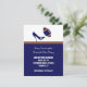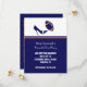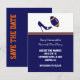 Anúncio de Save the Date de casamento divertido de futebol feito em azul escuro, laranja e branco. Gráficos de um salto alto stiletto azul chutando uma bola de futebol azul e laranja decoram a parte superior branca do cartão. A parte inferior do cartão é feita em azul escuro com uma faixa laranja perto do topo e texto branco personalizado pronto para ser personalizado com as informações do seu casamento. Um verso azul tem texto laranja correndo de lado e lendo Save The Date. Ótimos anúncios de Save The Date para o casal fã de futebol.