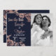 Cartão de Save-the-Date de casamento com flores modernas impressas em rosa dourado e tipografia elegante em fundo azul marinho. Design clássico e sofisticado, perfeito para casais modernos. Personalize com mensagem e monograma.
