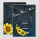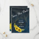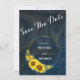 Um convite de casamento elegante com uma moldura dourada de girassóis alegres com fundo texturizado azul marinho.