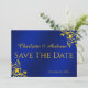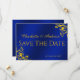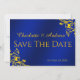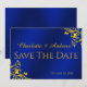 Cartões de save the date clássicos com azul real e dourado floral embelezados. Personalize com seus próprios nomes e data especial.