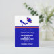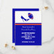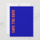 Anúncio divertido de casamento de futebol "Save the Date" feito em azul real, laranja e branco. Gráficos de um salto alto de stiletto azul real chutando uma bola de futebol azul real e laranja decoram a parte superior branca do cartão. A parte inferior do cartão é feita em azul real com uma faixa laranja perto do topo e texto branco personalizado pronto para personalizar, com as informações do seu casamento. Um verso azul real tem texto laranja correndo lateralmente e lendo "Save The Date". Ótimos anúncios de "Save The Date" para o casal fã de futebol.
