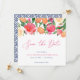 Kumquats e citrinos da moda acentuados por contrastes florais rosa brilhante para estes cartões Save The Date que estão na moda. O design do verso é inspirado num antigo design de Azulejo (azulejo branco e azul).