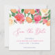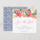 Kumquats e citrinos da moda acentuados por contrastes florais rosa brilhante para estes cartões Save The Date que estão na moda. O design do verso é inspirado num antigo design de Azulejo (azulejo branco e azul).