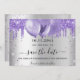 Um fundo com aspecto fino prateado decorado com brilho violeta, lavanda e balões. Personalize e adicione uma data e nome/idade. O texto: Salvar a Data é gravado com um script de estilo com letra de tendência grande.